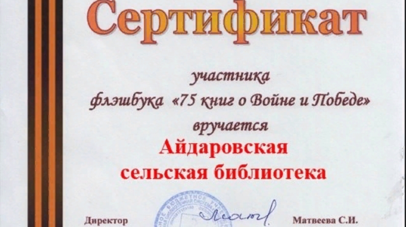 Ул фаҗигале вакыйгалар ерагая барган саен, әдәби әсәрләр– безнең тарихыбыз битләренең шаһитләре, шулкадәр кыйммәтлерәк була бара. Бөек Ватан сугышы темасына багышланган әсәрләр хәзерге тыныч, матур тормыш өчен гомерләрен дә кызганмаган, фронтта һәлак булган каһарманнарны онытмаска һәм яшәүнең кадерен белергә өйрәтәләр. Айдар авыл китапханәсе Пермь крае Кунгура шәһәренең үзәкләштерелгән китапханәләр системасы тарафыннан оештырылган, Россиядә Хәтер һәм Дан елына һәм Бөек Ватан сугышында җиңүнең 75 еллыгына багышланган «Сугыш һәм Җиңү турында 75 китап» дигән төбәкара челтәрле флэшбук акциясендә катнашып, сертификатка ия булды.