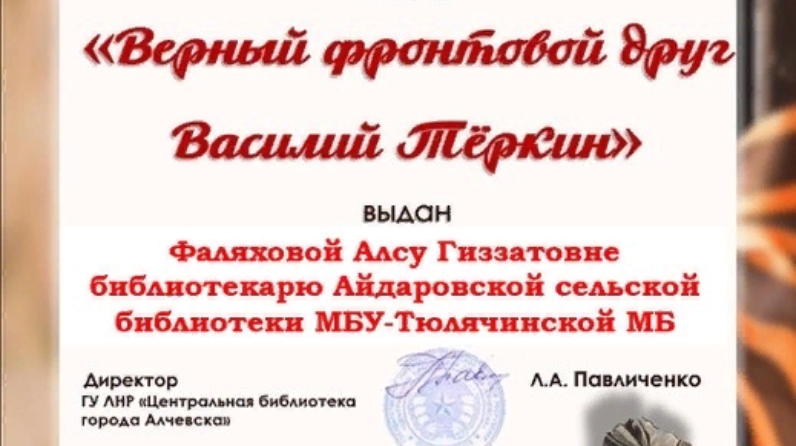 Айдар авыл китапханәсе Василий Теркин поэмасының 75 еллыгына һәм А.Т. Твардовскийның тууына 110 ел тулуга багышланган "Василий Теркин-ышанычлы фронт дусты" дип исемләнгән китапханәара челтәрле акциягә кушылды һәм сертификатка ия булды. Акциянең оештыручысы - Луганск Халык Республикасының Алчевск шәһәренең үзәк китапханәсе.