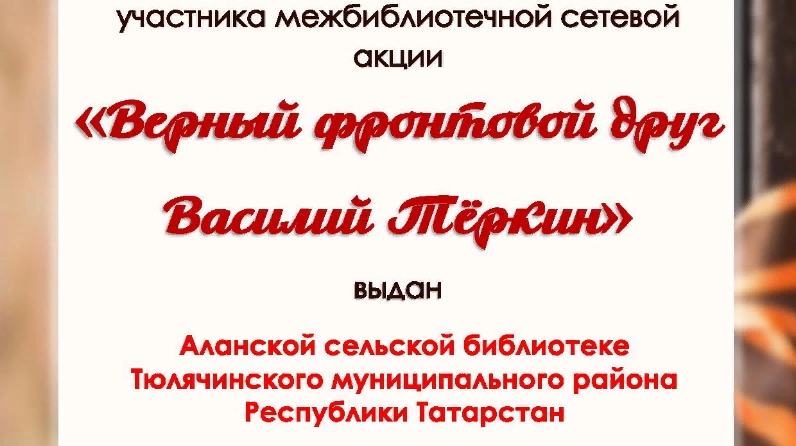 Алан авылы китапханәсе «Василий Теркин” поэмасының язылуына 75 ел тулу уңаеннан һәм А.Т.Твардовскийның тууына 110 ел тулу уңаеннан “Верный фронтовой друг Василий Теркин” дип исемләнгән акциягә катнашып, дипломга лаек булды.