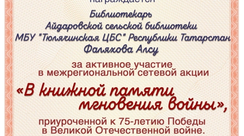 Айдар авыл китапханәчесе Алсу Фаляхова Түбән Новгород шәһәре Сормов районы китапханәләре тарафыннан оештырылган " В книжной памяти мгновения войны " дигән челтәрле акциягә кушылып Диплом алды.