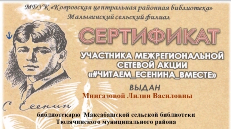 Максабаш авылы китапханәчесе Мингазова Л.В "Читаю Дома", “Читаем Есенина вместе”, “Жди меня и я вернусь”, “Читаем Тукая вместе” исемле челтәрле акцияләрдә катнашты. Әлеге акцияләрдә катнашып сертификатларга ия булды.