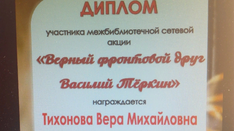 Ачы авыл китапханәсе Бөек Җиңүнең 75 еллыгына, "Василий Теркин" поэмасы язылуга 75 ел, А.Твардовскийның тууына 110 ел тулу уңаеннан "Верный фронтовой друг Василий Теркин" китапханәара челтәр акциясендә катнашып, дипломга ия булды.