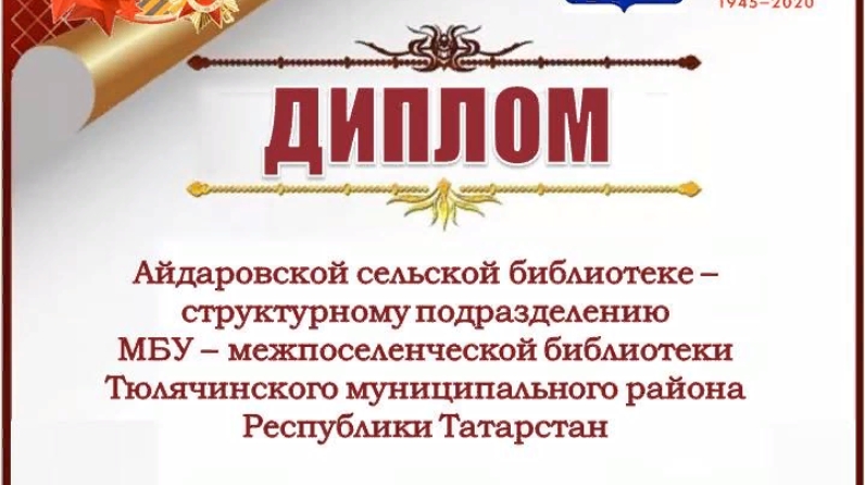 16 апрель көнне, Айдар авылы китапханәчесе Фаляхова Алсу Гыйззәт кызы “Үлемсез китап полкы” акциясенә кушылды һәм диплом белән бүләкләнде. Акциянең оештыручысы: Ростов өлкәсе Зимовников районы үзәк китапханәсе.