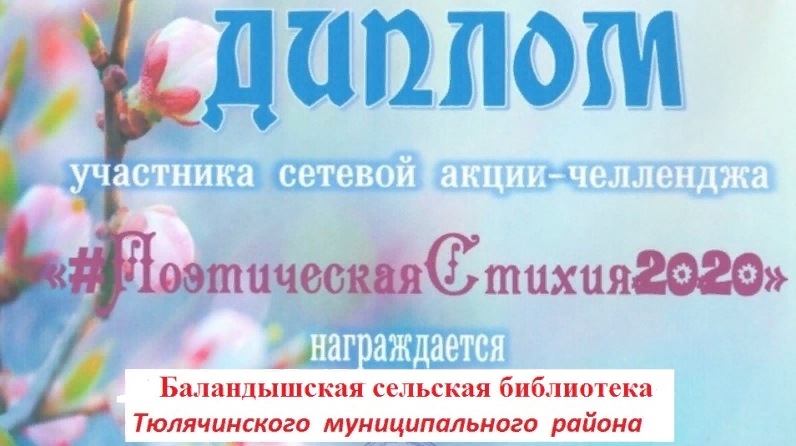 Баландыш авыл китапханәсе "Поэтическая стихия" челлендж акциясенә кушылып Дипломга ия булды.
