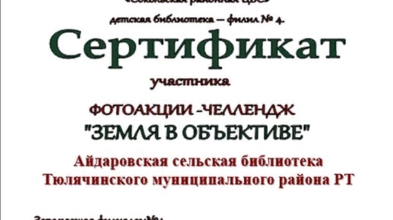 Вологодск өлкәсенең «Соколка район Үзәк балалар китапханәсенең № 4 филиалы оештырган “Җир объективта” дип исемләнгән фотоакциядә катнашып Айдар авылы китапханәчесе Фаляхова Алсу Гыйззәт кызы катнашучы сертификатына ия булды.