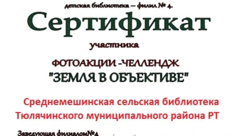 Урта Мишә авыл китапханәчесе Мухаметшина Гөлфия Исмәгыйль кызы, Вологодск өлкәсенең «Соколка район ҮБСЫ» балалар китапханәсе оештырган “Җир Объективта” дип исемләнгән ФОТОАКЦИЯДӘ катнашып, Сертификатка ия булды.