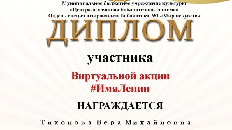 Ачы авыл китапханәсе «Имя Ленина» исемле виртуаль акциясендә катнашты һәм Диплом белән бүләкләнде.