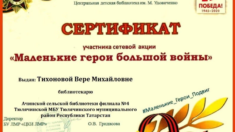 Ачы авыл китапханәсе “Маленькие герои большой войны” исемле челтәр акциясендә катнашты һәм Сертификат белән бүләкләнде. Акцияне оештыручы – Удовиченко исемендәге үзәк балалар китапханәсе.