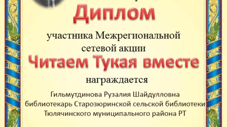 Иске Җөри авылы китапханәсе Зәй үзәк китапханәсенең Югары Шепкә китапханәсе игълан иткән "Тукайны бергә укыйбыз" исемле челтәрле акциядә катнашып диплом белән бүләкләнде.