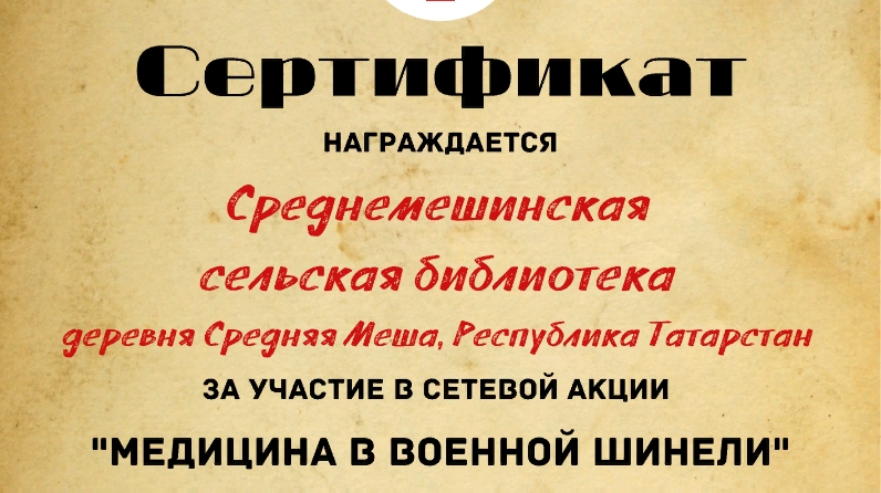 Урта Мишә авыл китапханәсе, медицина персоналы, Бөек Ватан сугышы елларында хәрби госпитальләр эшенә багышланган #Медицина_в военный_шинели челтәрле акциясенә кушылып, Сертификатка ия булды. Акция А.С. Пушкин исемендәге Үзәк шәһәр китапханәсе оештырган Хәтер һәм Дан елы кысаларында үткәрелә.