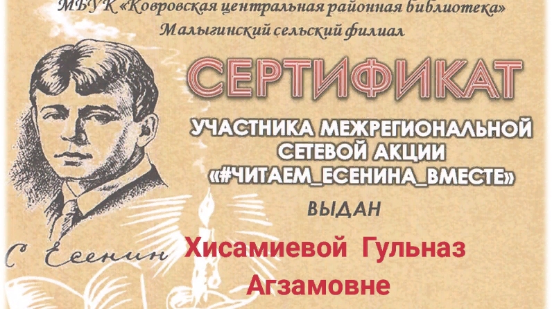 Алан авылы китапханәсе «Читаем Есенина вместе» төбәкара акциясендә һәм “Пушистый любимец” фотоконкурсында катнашып, диплом һәм сертификатка ия булды.