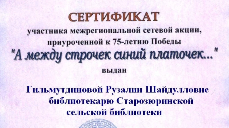 Гильмутдинова Рузалия Шайдулловна, библиотекарь Старозюринской сельской библиотеки приняла участие в сетевой акции "А между строчек синий платочек...", организатором которой является модельная юношеская библиотека №41 МБУ Центральная система массовых библиотек городского округа г. Уфа. За участие награждена сертификатом.