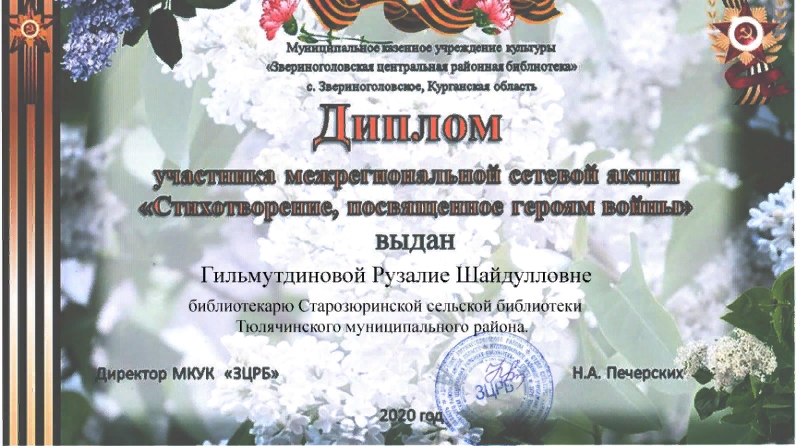 Иске Җөри авыл китапханәсе Курган өлкәсе Звериноголово үзәк район китапханәсе оештырган “Стихотворение, посвящённое героям войны” дип исемләнгән акциядә катнашты һәм диплом белән бүләкләнде.