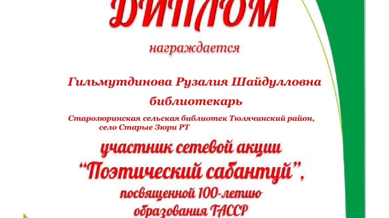 Иске Җөри авылы китапханәсе Чаллы шәһәренең 1 нче номерлы китапханәсе оештырган “Поэтический сабантуй” дип исемләнгән акциясендә катнашты һәм диплом белән бүләкләнде.