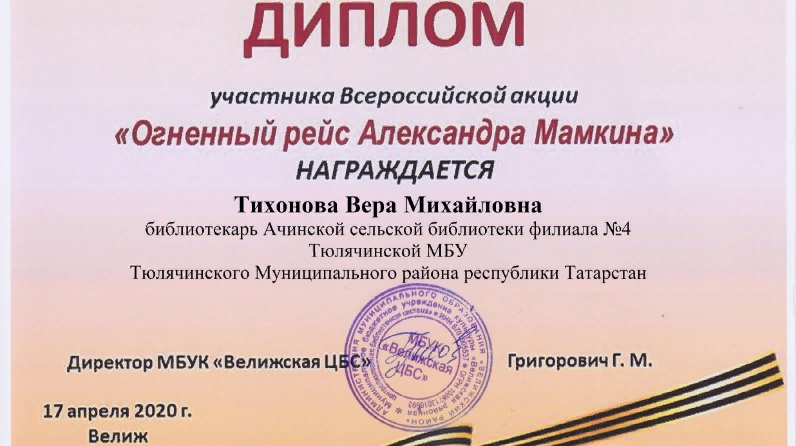Ачы авыл китапханәсе “Огненный рейс Александра Мамкина” Бөтенроссия акциясендә катнашты һәм Диплом белән бүләкләнде.