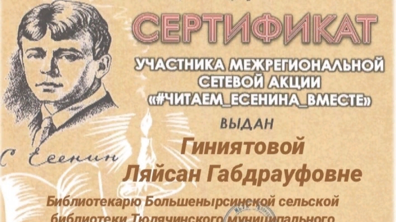 Олы Нырсы авыл китапханәсе "#Читаем Есенина вместе" исемле челтәрле акциягә кушылып, Сертификатка ия булды. Акцияне оештыручы - Коврово үзәк район китапханәсе.