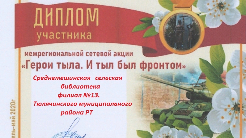 Урта Мишә авылы китапханәчесе Мухаметшина Гөлфия Исмәгыйль кызы “Герои тыла. И тыл был фронтом” исемле челтәрле акциядә катнашып Дипломга лаек булды. Акцияне оештыручы - Башкортостан Республикасының Уфа районы Михайловка авыл китапханәсе.