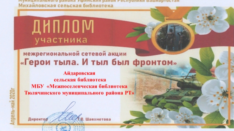 Айдар авылы китапханәчесе Фаляхова Алсу Гыйззәт кызы "Герои тыла. И тыл был был фронтом" исемле челтәрле акциядә катнашып Дипломга лаек булды. Акцияне оештыручы - Башкортостан Республикасының Уфа районы Михайловка авыл китапханәсе.