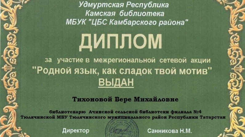 Ачы авылы китапханәчесе Тихонова Вера Михайловна, “Родной язык, как сладок твой мотив!" дип исемләнгән төбәкара челтәрле акциядә катнашып дипломга ия булды. Акцияне оештыручы - Удмурт Республикасы Камбар районы Кама китапханәсе.