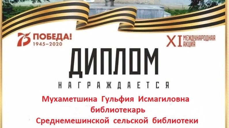 Бөек Җиңүнең 75 еллыгы уңаеннан Урта Мишә авыл китапханәсе “Читаем детям о войне” исемле XI нче халыкара акциядә катнашып Дипломга лаек булды.