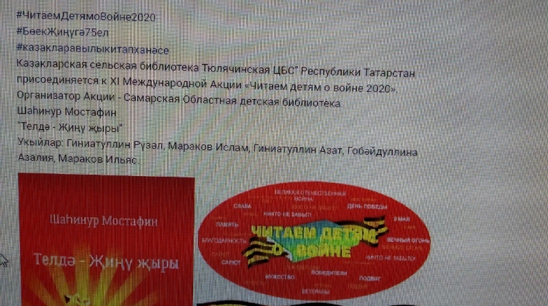 Гиниатуллин Рүзәл, Мараков Ислам, Гиниатуллин Азат, Гобәйдуллина Азалия, Мараков Ильяс Шаһинур Мостафинның "Телдә - Җиңү җыры" дигән шигырен укыдылар. Аларны берләштереп видео ясалды һәм #ЧитаемДетямоВойне2020 хештегы астында Вконтакте социаль челтәрендә урнаштырылды.