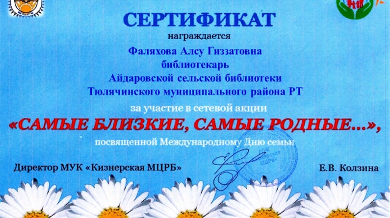 Айдар авылы китапханәчесе Алсу Фаляхова Халыкара гаилә көненә багышланган «Гаилә – бәхет терәге» , «Иң якыннарыбыз, иң туганнарыбыз” дип исемләнгән челтәрле акцияләргә кушылып, диплом, сертификатларга ия булды. Акцияләрнең максаты: гаилә һәм гаилә кыйммәтләре турында китап укуга кызыксыну уяту.