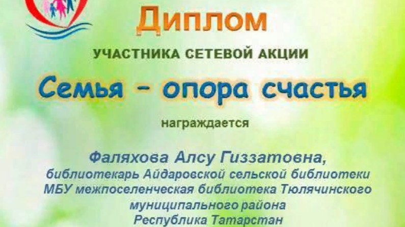 Айдар авылы китапханәчесе Алсу Фаляхова Халыкара гаилә көненә багышланган «Гаилә – бәхет терәге» , «Самые близкие, самые родные…» дип исемләнгән челтәрле акцияләргә кушылып Диплом, Сертификатларга ия булды. Акцияләрнең максаты: гаилә һәм гаилә кыйммәтләре турында китап укуга кызыксыну уяту.