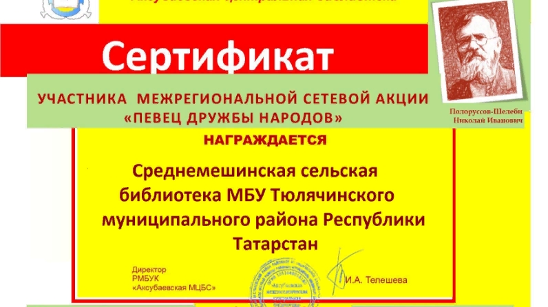 Урта Мишә авыл китапханәсе Аксубай районы үзәк китапханәсе үткәргән “Халыклар дуслыгы җырчысы” исемле челтәрле акциягә кушылып Сертификат алды.