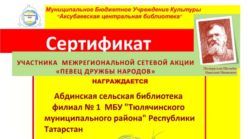 Әбде авыл китапханәсе «Певец дружбы народов» төбәкара челтәр акциясендә катнашып Сертификат белән бүләкләнде.