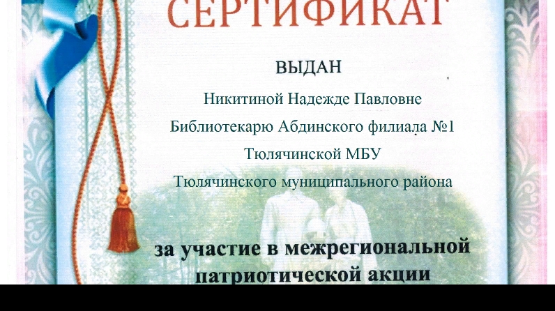 Әбде авыл китапханәсе «Җиңү Чәчәкләре " төбәкара патриотик акциядә катнашты һәм Сертификат белән бүләкләнде. Акциянең оештыручысы - «Максатиха үзәк китапханәсе» МКУК.