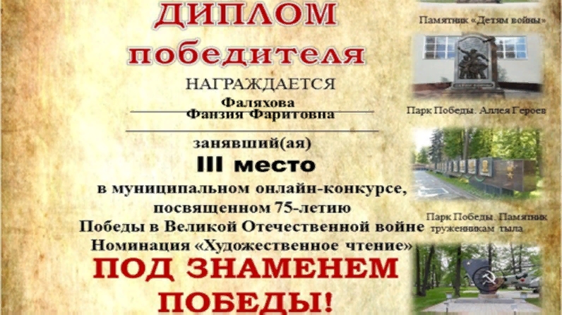 Айдар авылы китапханәсе китап укучылары Шайхетдинова Динә, Фаляхова Фәнзия Бөек җиңүнең 75 еллыгы уңаеннан оештырылган «Җиңү байрагы астында» онлайн-конкурсында катнашып Диплом белән бүләкләнделәр. Конкурсның оештыручысы - ТР «Яшел Үзән муниципаль районының үзәкләштерелгән китапханәләр системасы» муниципаль бюджет учреждениесе Үзәк китапханәсе.