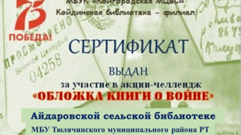 Татарстан Республикасы Теләче муниципаль районының Айдар авыл китапханәсе "Обложка книги о войне" дигән челлендж акциясенә кушылып Сертификатка ия булды. Акциянең оештыручы - Койды китапханәсе-6 филиал