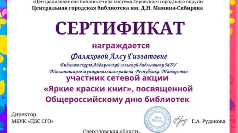 Теләче муниципаль районының Айдар авылы китапханәсе "Яркие краски книг" дигән челтәрле акциядә катнашып Сертификатка ия булды.