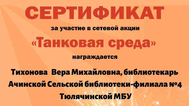 Ачы авыл китапханәсе РФ Президенты тарафыннан игълан ителгән Хәтер һәм Дан елы кысаларында үткәрелә торган «Танковая среда» челтәрле акциясендә катнашты. Акция Бөек Ватан сугышында Җиңүнең 75 еллыгына һәм илебез танк төзелешенең 100 еллыгына багышланды. Акциянең оештыручысы - Чиләбе шәһәренең А. С. Пушкин исемендәге Үзәк китапханә.