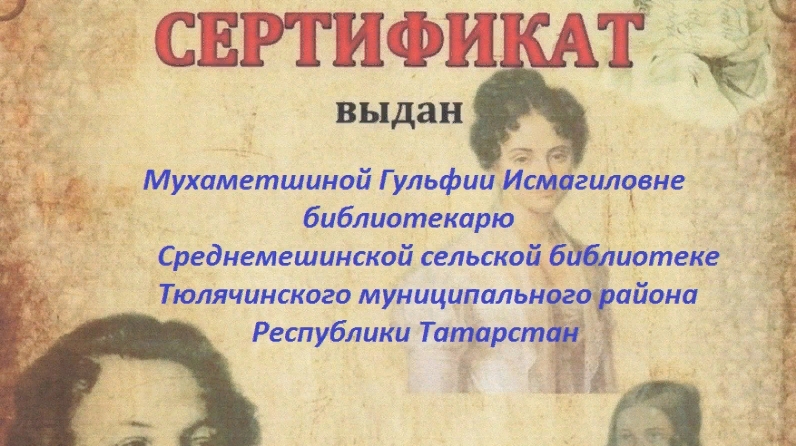 Урта Мишә авылы китапханәчесе Мухаметшина Гөлфия Пушкин көненә багышланган «Он считал своим долгом быть влюбленным» исемле төбәкара челтәр акциясендә катнашып, Сертификат алды. Акцияне оештыручы-Татарстан Республикасы Тәтеш муниципаль районы «Тәтеш җирлекара китапханәсе» Олы Тархан авыл җирлеге китапханәсе.