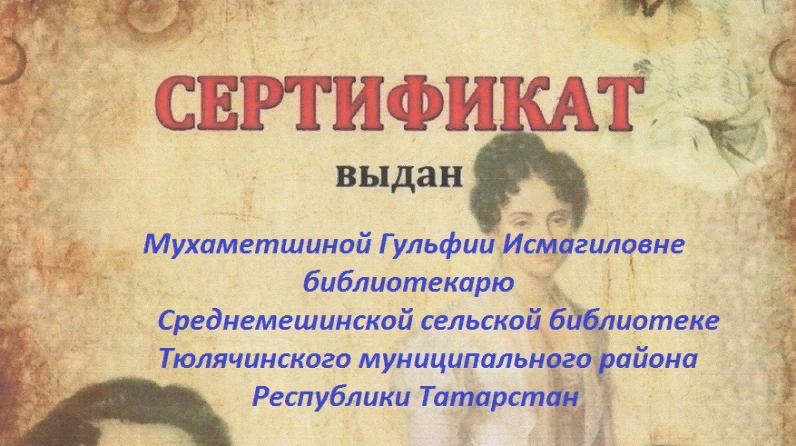 Урта Мишә авылы китапханәчесе Мухаметшина Гөлфия Пушкин көненә багышланган «Он считал своим долгом быть влюбленным» исемле төбәкара челтәрле акциясендә катнашып Сертификатка булды. Акцияне оештыручы - Татарстан Республикасы Тәтеш муниципаль районы «Тәтеш җирлекара китапханәсе»нең Олы Тархан авыл җирлеге китапханәсе.