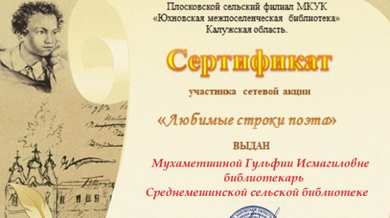 Теләче муниципаль районы Урта Мишә авылы китапханәчесе Мухаметшина Гөлфия Исмәгыйль кызы Калуга өлкәсе "Юхновка җирлекара китапханәсе"нең Плосковой авыл китапханәсе оештырган “Любимые строки поэта” исемле акциядә катнашып Сертификатка ия булды.