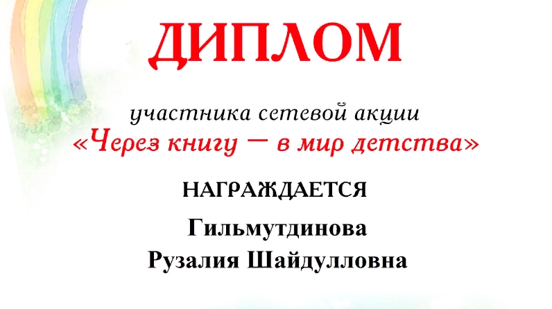 Иске Җөри авылы китапханәчесе Гыйлметдинова Рузалия Белгород өлкәсе Валуйск шәһәренең үзәкләштерелгән китапханәләр системасы оештырган «Китап аша балачак дөньясына» исемле китапханәара челтәрле акциясендә катнашып Дипломга ия булды.