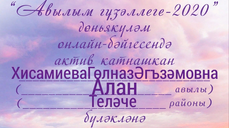 Алан авылы китапханәчесе Хисамиева Гөлназ Әгъзәм кызы “Авылым гүзәллеге” Бөтендөнья онлайн-конкурсында катнашып,дипломга ия булды.Конкурс татар авылларының тарихын яктыртуга багышланган һәм аны Татнетны үстерү фонды оештырды.