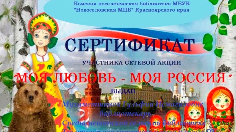 Урта Мишә авылы китапханәчесе Мухаметшина Гөлфия Красноярск өлкәсе Комск авыл җирлегенең Новоселовск китапханәсе үткәргән “Моя любовь - моя Россия” исемле челтәрле акциядә катнашып Сертификатка ия булды.