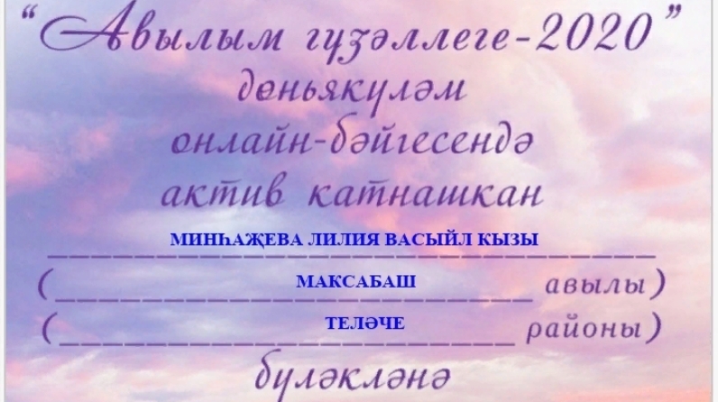 "Авылым гүзәллеге - 2020"дөньякүләм онлайн бәйгедә актив катнашкан өчен Максабаш авылы китапханәчесе Минһаҗева Лилия Васыйл кызы Диплом белән бүләкләнде