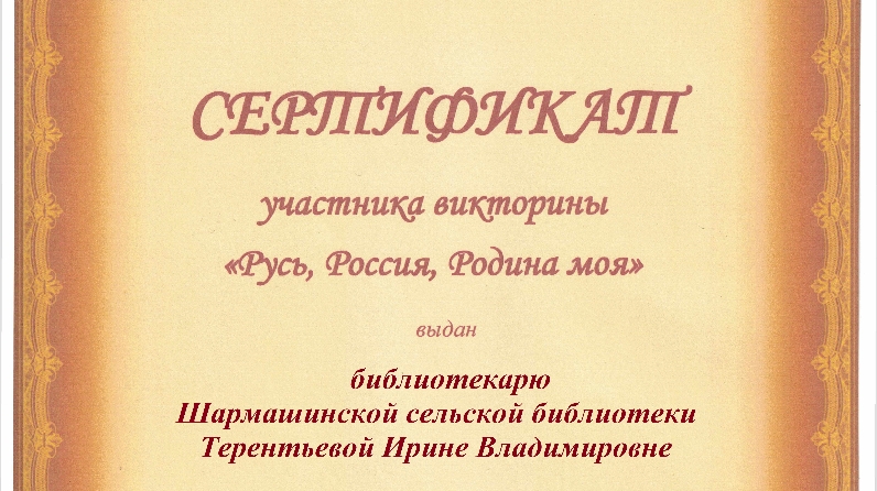 Шармыш авылы китапханәчесе Терентьева Ирина Владимировна «Русь, Россия, Туган илем...» дип исемләнгән онлайн-викторинага кушылды. Әлеге викторинанада кушылып Сертификатка ия булды.