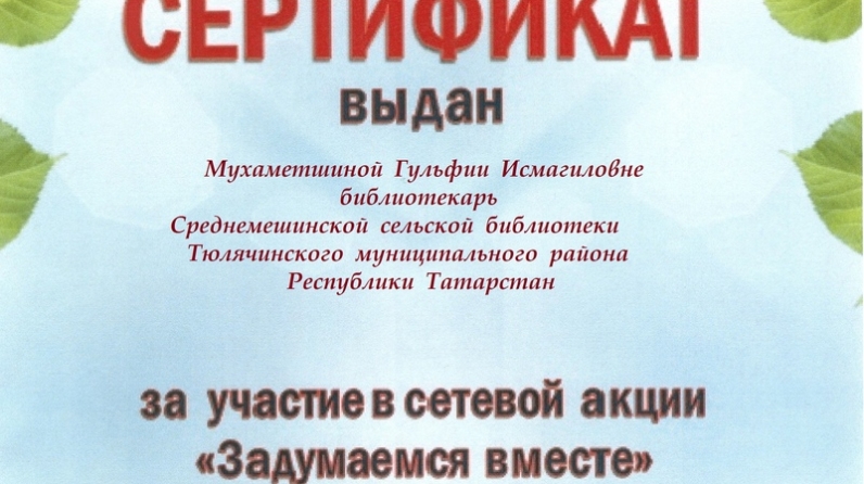 Урта Мишә авыл китапханәчесе Мухаметшина Гөлфия Исмәгыйль кызы, Башкортстан Республикасы Уфа шәһәренең 1 нче номерлы Үзәк китапханәсе үткәргән “Бергәләп уйланабыз” исемле челтәрле акциядә катнашып Сертифкат алды.