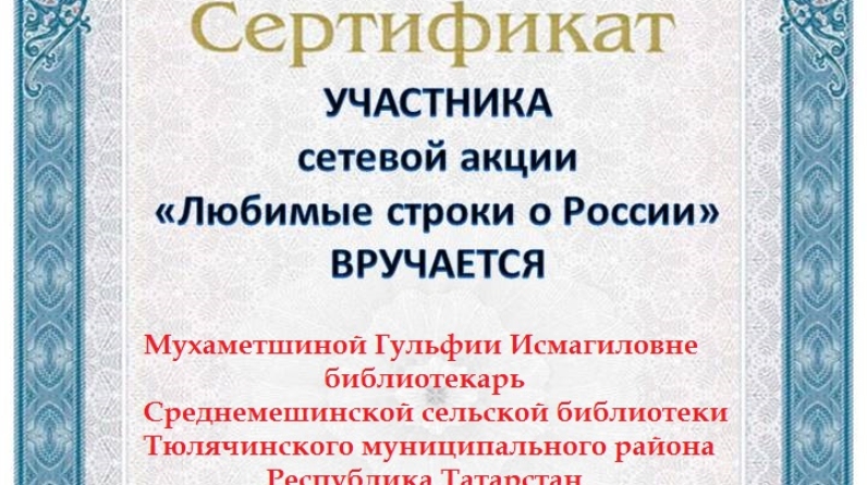 Урта Мишә авыл китапханәчесе Мухаметшина Гөлфия Исмәгыйль кызы, Россия көненә багышланган “Россия турында яраткан юллар" дигән челтәрле акциясенә кушылып, Сертификат алды. Акцияне оештыручы: Башкортостан Республикасының Благовар районы үзәк китапханәсе.