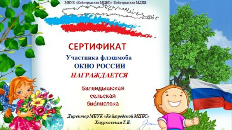 Баландыш авыл китапханәсе Россия көненә багышланган һәм Ватанга мәхәббәт тәрбияләүгә юнәлдерелгән “Россия тәрәзәсе” Бөтенроссия акциясендә катнашты һәм Сертификатка ия булды.