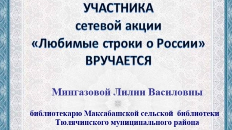 Максабаш авыл китапханәчесе Мингазова Лилия Васыйл кызы, Россия көненә багышланган “Россия турында яраткан юллар" дигән челтәрле акциясенә кушылып, Сертификат алды. Акцияне оештыручы: Башкортостан Республикасының Благовар районы үзәк китапханәсе.