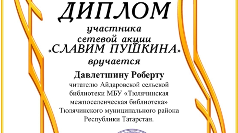Айдар авылы китапханәсе китап укучылары Динә Габдрахманова һәм Роберт Давлетшин Пушкин көненә багышланган «Пушкинны данлыйбыз» дигән челтәрле акциядә катнашып Дипломга ия булдылар. Оештыручысы: Түбән Вартовск шәһәренең 7 нче номерлы балалар-яшүсмерләр китапханәсе.