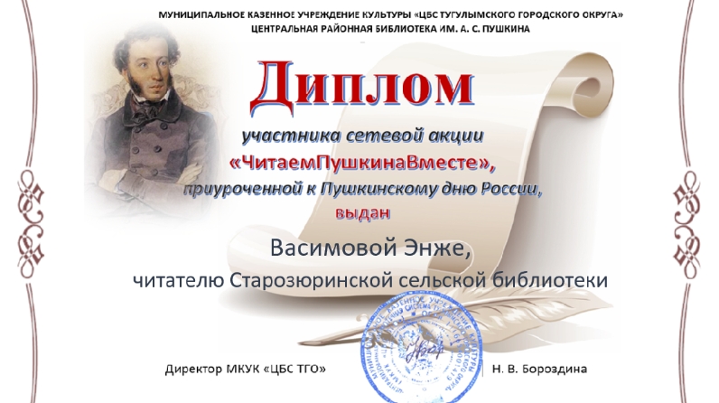 Әлеге дата уңаеннан Иске Җөри авылы китапханәчесе “Бергәләп Пушкинны укыйбыз” дип исемләнгән онлайн марофонда катнашты. Оештыручысы – Тугулым шәһәр округының А.С. Пушкин исемендәге Үзәк китапханә. Марофонда 5 укучы катнашып Дипломга ия булдылар.