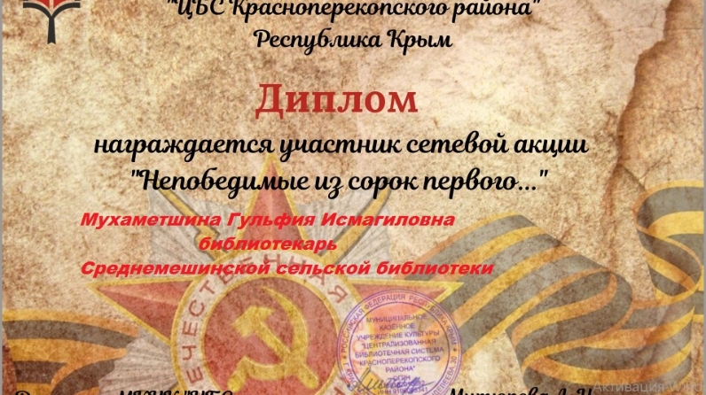 Урта Мишә авылы китапханәчесе Мухаметшина Гөлфия Хәтер һәм кайгы көненә багышланган «Непобедимые из сорок первого...» исемле патриотик акциядә катнашып Диплом белән бүләкләнде. Акциянең оештыручысы: Крым Республикасы Красноперекопск шәһәре үзәк китапханәсе.