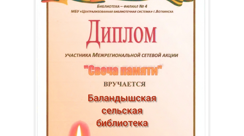 Баландыш авыл китапханәсе «Хәтер шәме " Бөтенроссия акциясендә катнашып Дипломга ия булды.